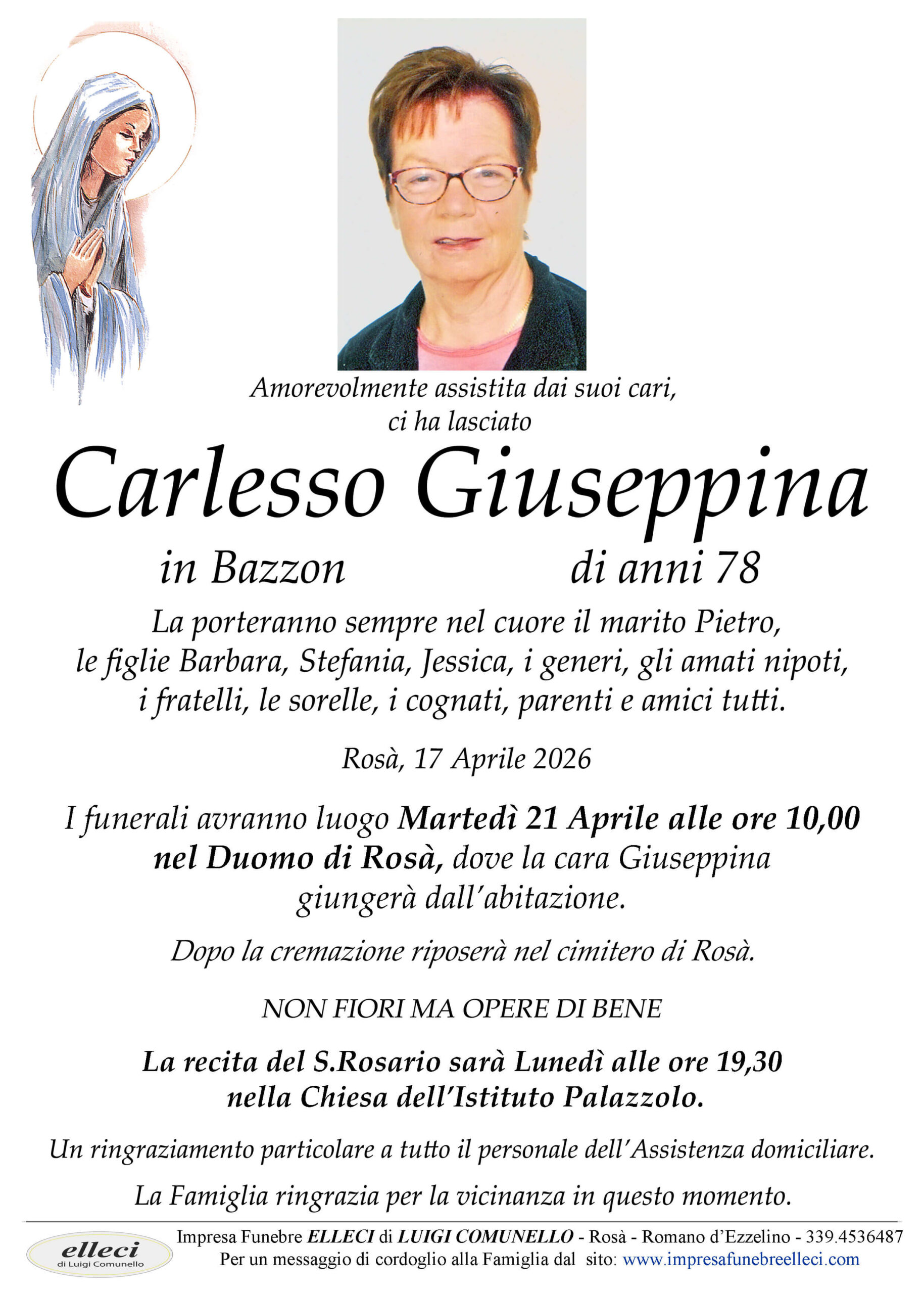 17 Apr CARLESSO GIUSEPPINA Posted at 12:31h in Uncategorized by ivan Comunello 0 Comments 0 Likes Funerale Carlesso Giuseppina Luogo: Rosà Data: 21 Aprile 2026 Orario: 10.00 . VEDI EPIGRAFE Scrivi le tue condoglianze Rispondi al quesito matematico anti-spam per procedere: 10+3? Ho letto la nostra PRIVACY POLICY e presto il consenso al trattamento dei dati personali per inviare le condoglianze. Δ