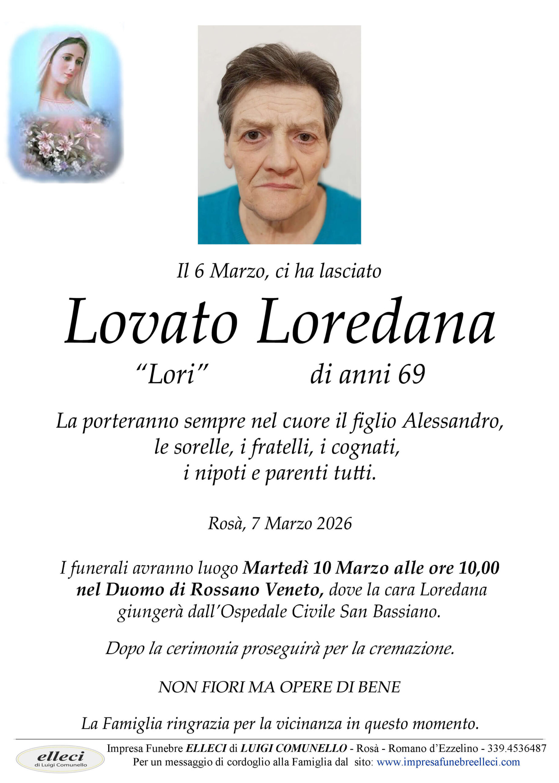 07 Mar LOVATO LOREDANA Posted at 14:48h in Uncategorized by ivan Comunello 0 Comments 0 Likes Funerale Lovato Loredana Luogo: Rossano Veneto Data: 10 Marzo 2026 Orario: 10.00 . VEDI EPIGRAFE Scrivi le tue condoglianze Rispondi al quesito matematico anti-spam per procedere: 10+3? Ho letto la nostra PRIVACY POLICY e presto il consenso al trattamento dei dati personali per inviare le condoglianze. Δ